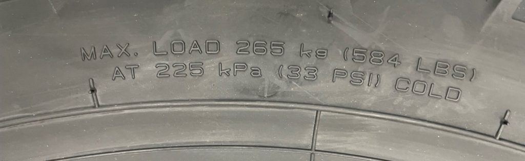 最大空気圧はタイヤのサイド部に空気圧の表示があります。(下記画像では225kPa)