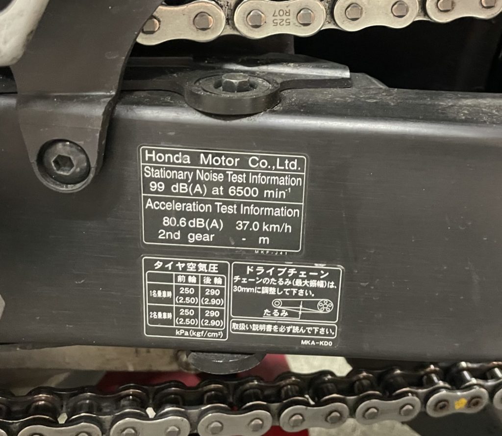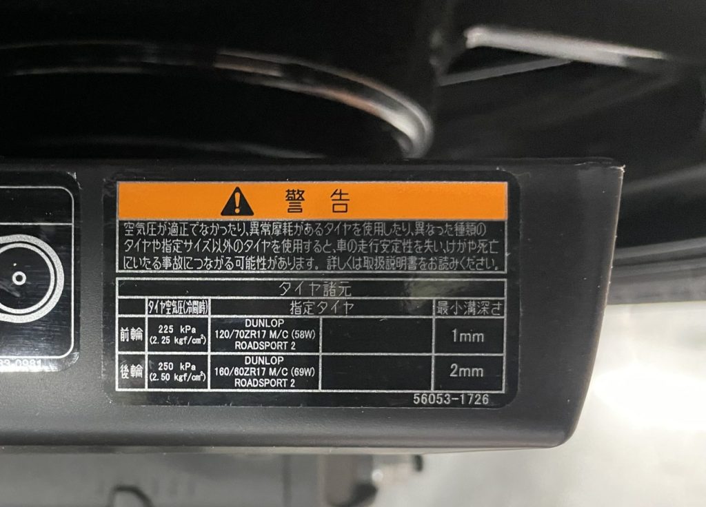 入れる量:純正空気圧の場合、スイングアーム進行方向左側やシート内側にシールを確認