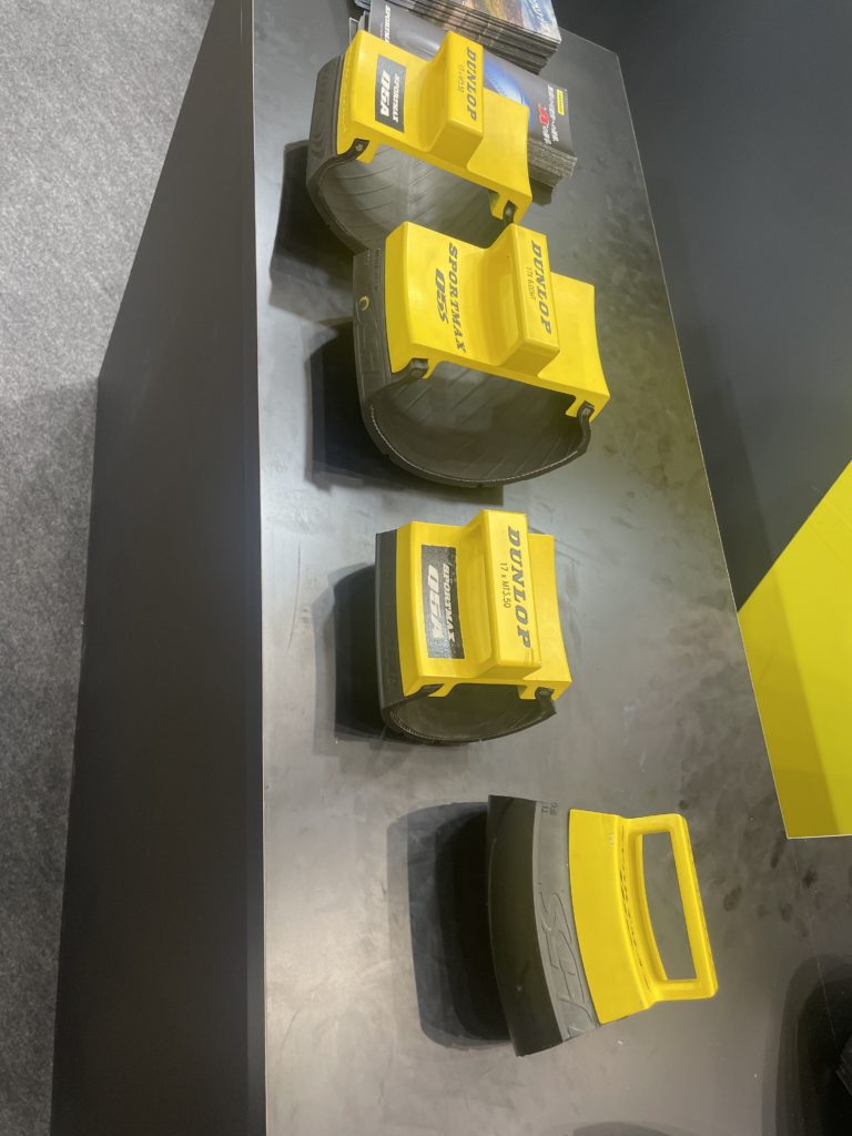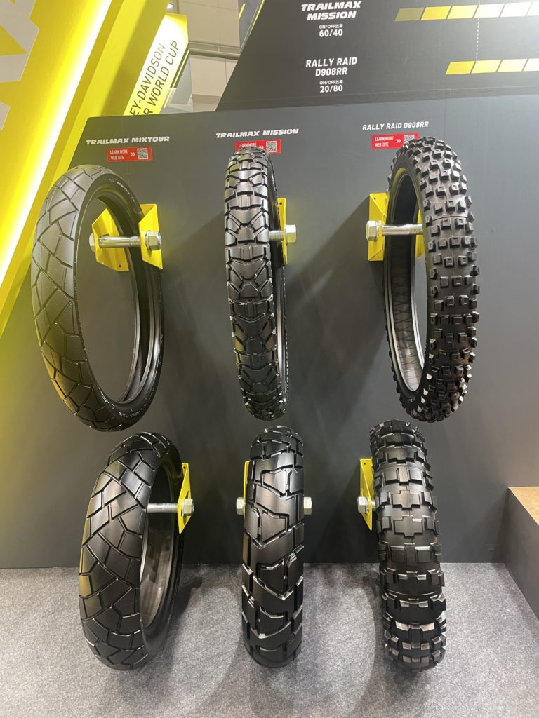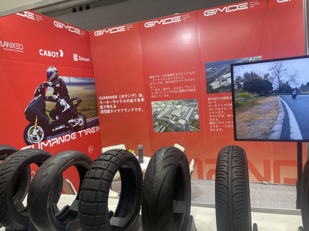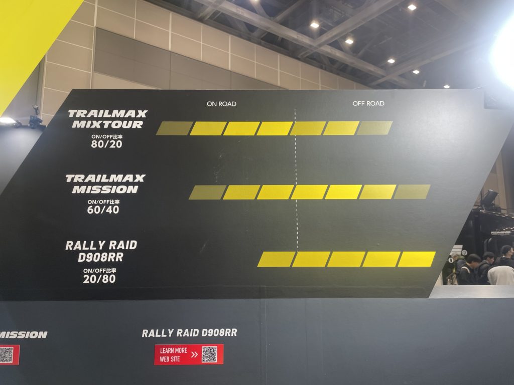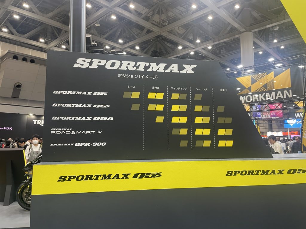 ダンロップではアドベンチャータイヤ、SPORTMAXの展示を行っており、それぞれのタイヤがどのシチュエーションに適しているかグラフで表示していました。